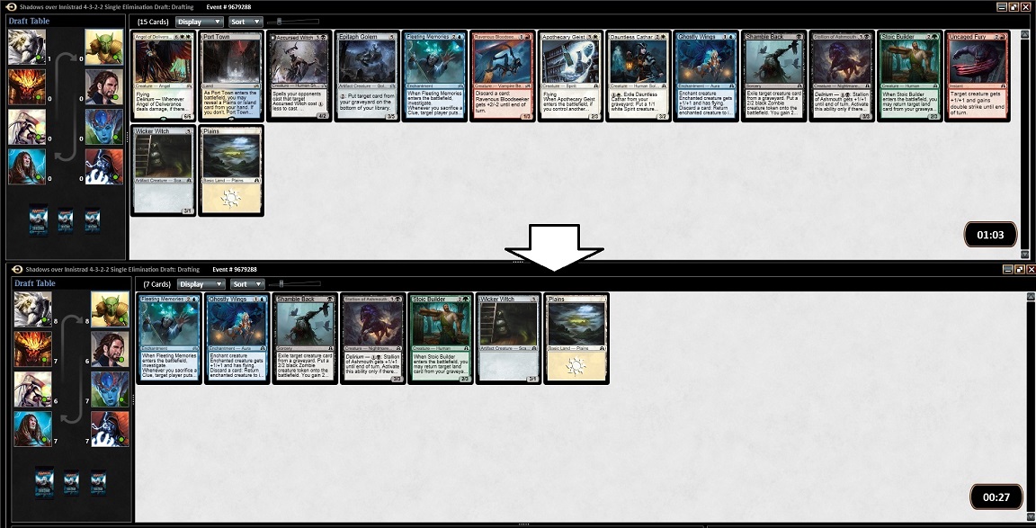 束の間の記憶が1周してきたということは青緑ライブラリ破壊は卓にいない筈。赤白になる場合でもまだ天使の粛清が取れていないし、赤黒になる可能性もまだあるということでこれは助かる情報。港町含めて白のカードが4枚消えているので1-2〜1-8がほぼ白かったのではあるが、白は混んでそうということで灰口の雄馬取って赤黒を準備しておくことに。